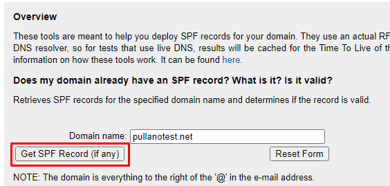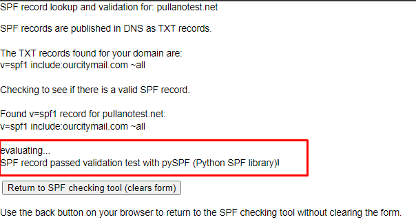 Does my domain already have an SPF record? What is it? Is it valid?" - As shown below. You're looking for the highlighted line in the second screenshot - the tool tells you in plain text whether or not your properly validated.