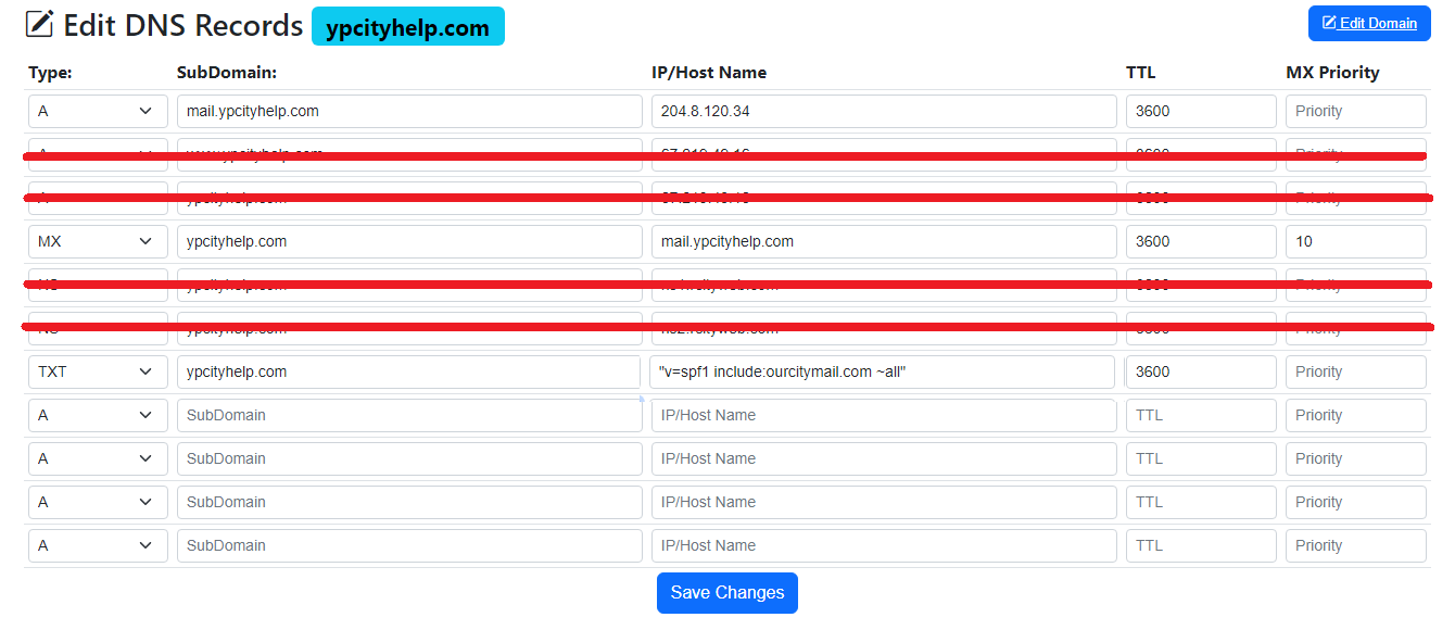 In this example image of our DNS tool, I've crossed out any records that aren't relevant to email setup. In this case, the customerdomain.com placeholder is ypcityhelp.com (as ypcityhelp.com is the customers domain in this example) & you can easily add additional records if needed at the bottom. Once you've added (or updated) the appropriate DNS Records, click Save Changes at the bottom. Once this is complete, move on to Testing Our Work.