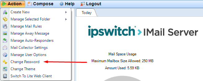Users can manually change their password at any time using the option Change Password under the Action menu in the Web Client (mail.customerdomain.com)