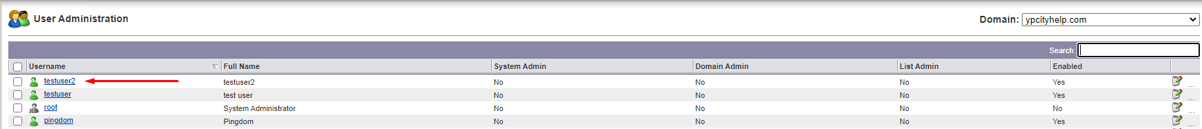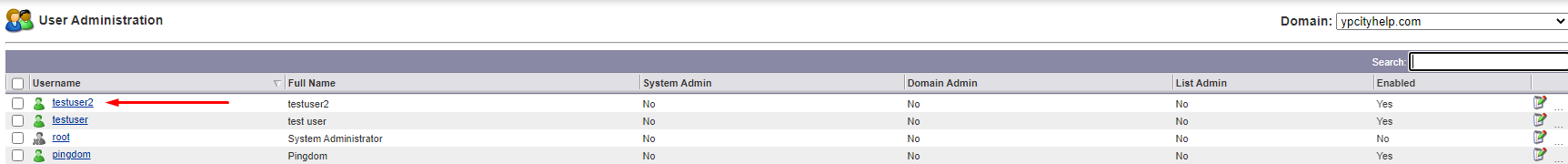 Adding a forwarding address is extremely simple - we're going to go to Manage Users & select the Customer Domain just as we did in the section Adding Customer (email) Accounts. From there, Select the account you want to modify by clicking the username of the account.