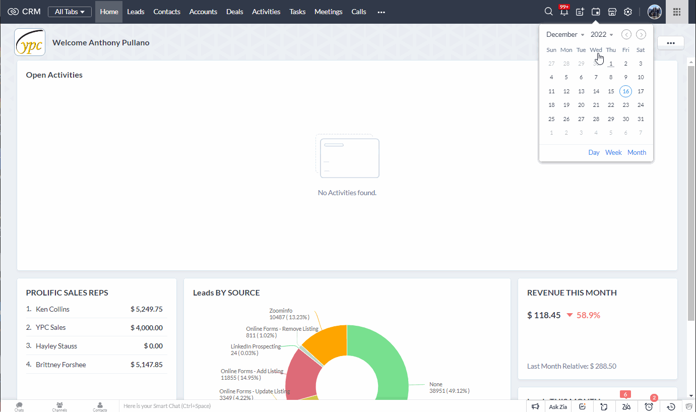 Previously at YPC, we'd manage calendar sharing completely in outlook, by manually sharing calendars to our coworkers as needed via outlook. In Zoho, the concept of sharing is a thing of the past. In Zoho, your data is already shared for you based on position. In order to see it, we're going to head over to our own Calendar within Zoho (the calendar icon on the top right bar). From here, you have a dropdown in the top left which, by default, says My Meetings or My Meetings & Calls. Select this dropdown to see All Users, specific groups, or individual / groups of Users.