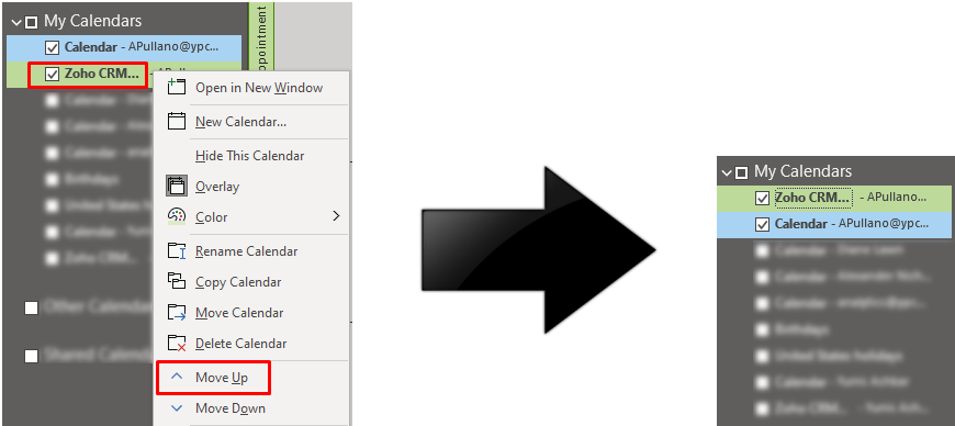 Making your Zoho Calendar your primary in outlook (so that events are automatically saved there when created in outlook) is very simple. All we have to do is Rt click > Move Up til the Zoho Calendar is at the top. The top calendar is where your items will save by default.