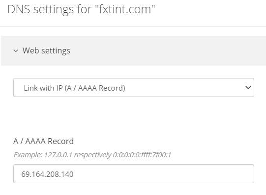 Now we can go back into Moniker to add the IP Address. To do this, on the Domain page, scroll down to the section called “Subdomain overview”. Click on the domain, which will display a pop up with DNS Record settings. Under “Web Settings” select “Link with IP (A / AAAA Record)”, and then copy/paste the IP Address from Flywheel here, then click save: